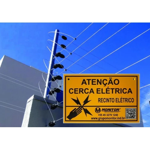 A placa indicativa de advertência de cerca elétrica, é indicada para advertir que os fios da cerca e..